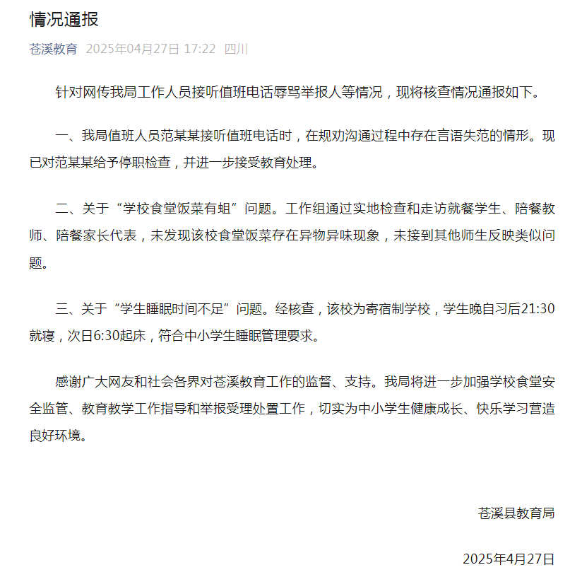 四川苍溪县教育局通报“工作人员接听值班电话辱骂举报人”等情况:对值班人员给予停职检查